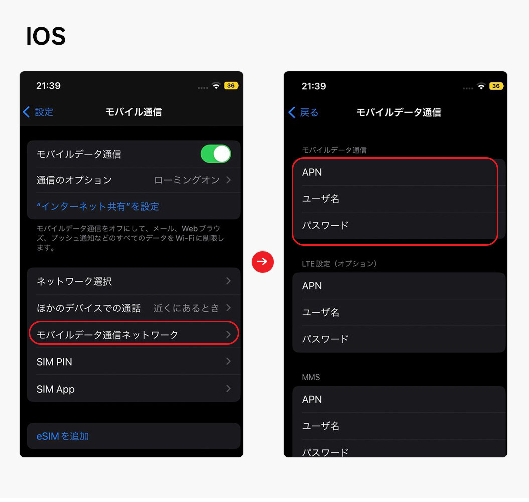 「設定」→「モバイルネットワーク」→「追加したeSIM回線をタップ」→「アクセスポイント名」